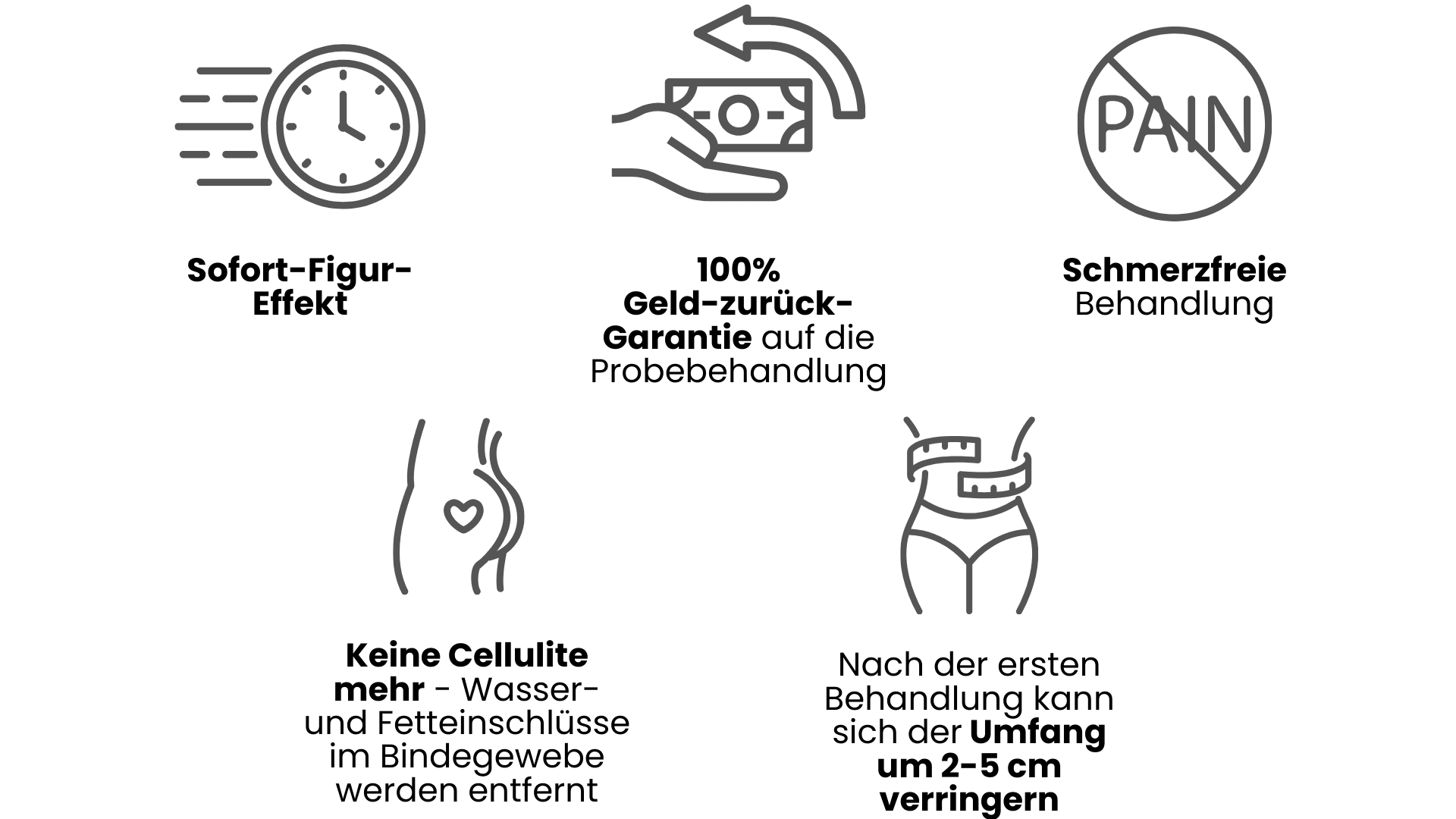 Unsere einzigartige Methode führt dich in kurzer Zeit zu deinem Traum-Body. Ohne Anstrengung, ohne hohen Zeitaufwand. Hinlegen, Elektroden werden befestigt, entspannen. Bereits nach der ersten Behandlung verlierst du 2-5 cm deines Körperumfangs. Du glaubst uns nicht? Kein Problem! Sollte dieses Ergebnis nicht eintreffen, erhältst du dank der 100%-Geld-Zurück-Garantie den vollen Preis der Probebehandlung zurück erstattet. Somit besteht für dich absolut kein Risiko.